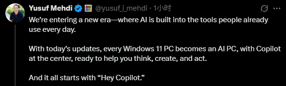 微软执行副总裁兼消费者首席营销官Yusuf Mehdi在社交平台X上写道,“我们正在进入一个新时代——人工智能已经融入到人们日常使用的工具中。”